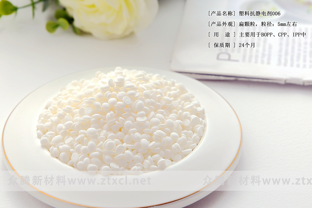 (1)由于其標準顆粒形態,適合與塑膠顆粒一起攪拌后直接注塑,擠出,吹膜,相對于傳統的粉末產品,不會產生架橋和粘壁現象,拌料時無粉塵,有利于環境清潔。其百分百高純度抗靜電劑有效含量,使制品有效起到靜電耗散作用,免受環境灰塵污染,持續保持,清潔光亮。同時也可做成高含量的抗靜電母料,提高生產效率。可以和所有已知的添加劑共同使用。也可和填料共同使用。使用 006后,可達 107Ω—108Ω。